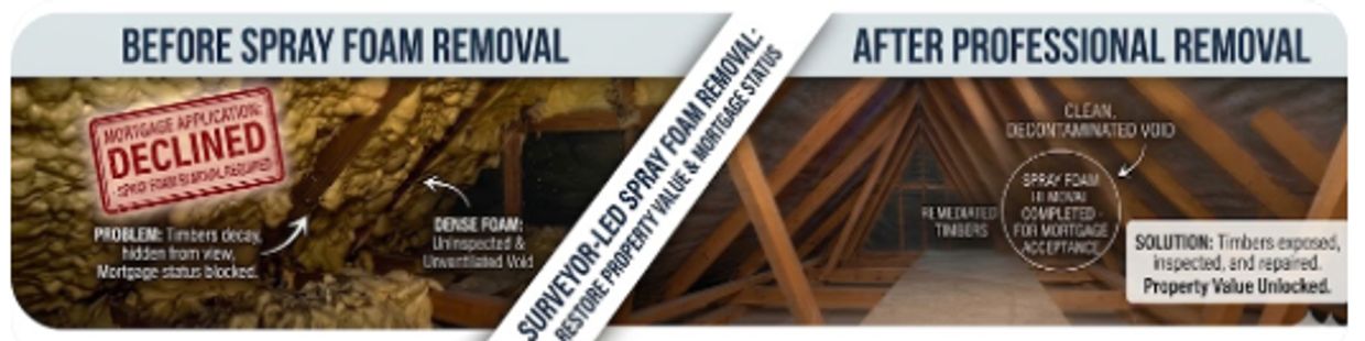We perform spray foam removal to ensure a RICS-qualified surveyor can inspect the roof structure entirely unencumbered.